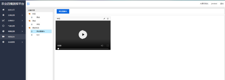 监控主页显现装备列表、大屏可视化、舆图展现等菜单信息。显现泥土墒情、虫情、景象形象监测图标及装备的运转状况。